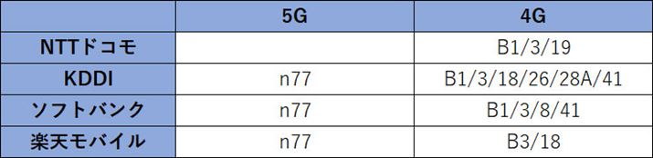 下の表は、5Gと4Gについて本機で対応する周波数帯を通信キャリア別にまとめたものだ。5Gについては、NTTドコモが利用できる対応バンドはない。KDDIについても、n77ひとつだけでn78は利用できない。NTTドコモの4GではB1、B3、B19の3バンドのみの対応なので、特にNTTドコモのネットワークを利用した場合、一般的な用途での通信速度を期待するのは少々厳しいかもしれない。