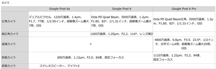 「Pixel 6a」は、メインカメラにデュアルピクセル広角カメラ、「Pixel 6」と「Pixel 6 Pro」はOcta PD Quad Bayer広角カメラを搭載している。Octa PD Quad Bayer広角カメラは50MPの高画素センサーで、4つのピクセルを擬似的にひとつのピクセルとして扱う「ピクセルビニング」という技術を採用。Pixel 5のデュアルピクセル広角カメラと比べて2.5倍の光をとらえられるとうたわれている。