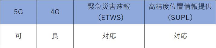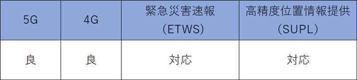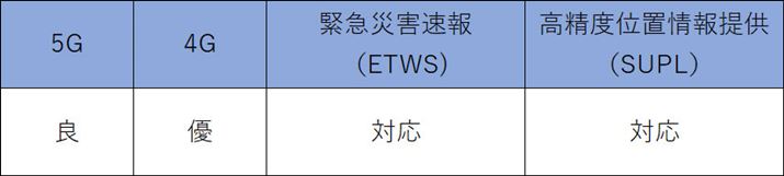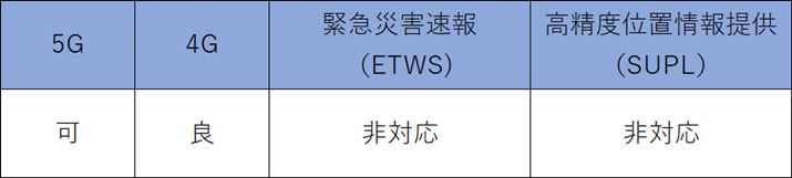 5Gの対応周波数帯はn77のみで、ミリ波にも非対応となっているため、NTTドコモの5Gとは適合しない。なお4Gの対応周波数帯はB1/3/8/18/19/26/28Aとなっており、NTTドコモの4Gではそのうち、B1/3/19が対応する。なお、B28AはB28のうち一部に対応ということで、NTTドコモが保有するB28(B28A)とは、ずれがある。また、緊急災害速報と高精度位置情報提供もともに非対応だ。