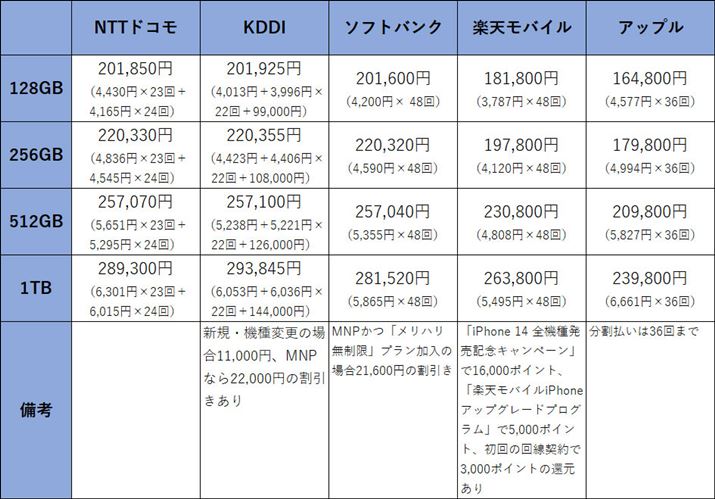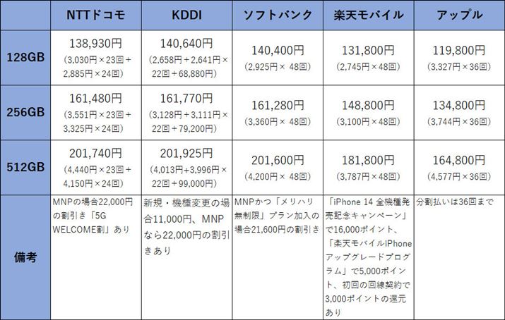 価格を比較すると、4モデルともアップルストアの直販が安い。一括払いで購入するのであれば候補の筆頭になるだろう。また、回線契約がないので、MVNOの格安SIMや通信キャリアのオンライン専用ブランドのような安価な料金プランとも組み合わせやすい。いっぽう、金利なしの分割払いは最大で36回払いまでで、48回払いは選ぶことができないので、月々の支払いを安く抑えたい場合には不向きだ。もし、月々の支払いを安く抑えたいなら、価格が安いうえに48回払いを選べる楽天モバイルが有力な選択肢になるだろう。