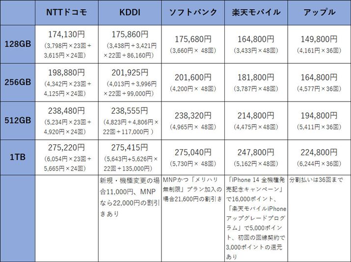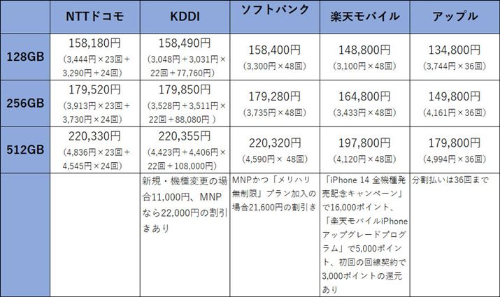2022年9月16日から発売されるアップル「iPhone 14」シリーズ。折からの円安の影響もあって、価格は概して高い。しかし、4キャリアおよびアップルが発表した価格の差は意外と大きい。端末ごとに比較した。