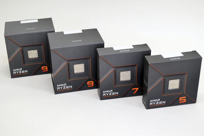 今回AMDからお借りしてチェックした「Ryzen 9 7950X」「Ryzen 9 7900X」「Ryzen 7 7700X」「Ryzen 5 7600X」。「Ryzen 7 7700X」と「Ryzen 5 7600X」のパッケージは薄めになっているが、CPU自体の形状は「Ryzen 9 7950X」や「Ryzen 9 7900X」と同様だ