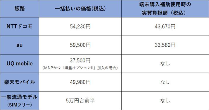 各販売ルートの価格を以下にまとめた。一括払いなら楽天モバイルが安価だが、端末の下取りを条件にした端末購入補助「スマホトクするプログラム」を使用するとauもかなり割安、MNPならUQ mobileも魅力的だ。条件によって価格が異なるので、どこが最安とは一概に言いにくい状況となっている。
