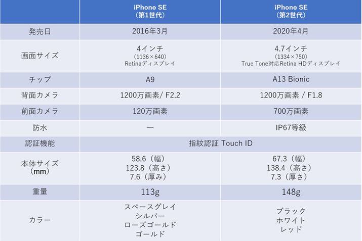 まずは第2世代の「iPhone SE」を第1世代の「iPhone SE」と比較しながらレビューしていこう。「iPhone SE」は小型ボディで価格も手ごろなiPhoneとして幅広い世代に人気のモデルだ。初代モデルが発売されたのが2016年、第2世代モデルはその4年後の2020年に発売された。