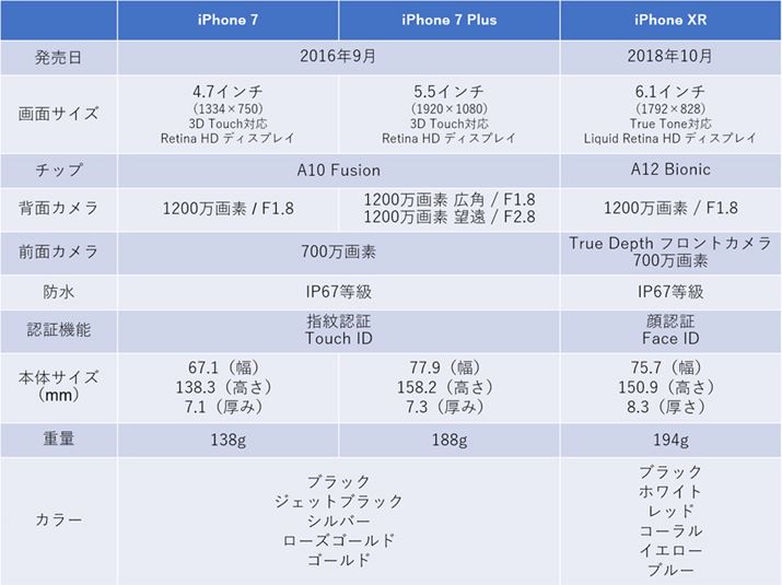 認証機能以外には、画面と本体のサイズに注目したい。画面サイズが4.7インチの「iPhone 7」が3モデルの中で一番小さいのはわかるが、画面サイズが5.5インチの「iPhone 7 Plus」と6.1インチの「iPhone XR」を比べると画面が大きな「iPhone XR」のほうが実はコンパクトなのだ。「iPhone XR」ではホームボタンが廃止されたのが大きな理由だが、「iPhone 7 Plus」ユーザーが「iPhone XR」に乗り換えると、画面が大きくなりつつ本体はコンパクトになるので、いいことずくめだ。