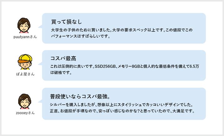上記に引用したものを含むユーザーレビューの件数は22件(※)で、その多くは日常使うPCとしてのコストパフォーマンスを高く評価している。