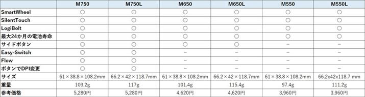さて、「M750」「M650」「M550」はどのような点に違いが設けられているのだろうか? それぞれのモデルには、ボディが少し大きい「L(Large)」モデルが用意されている。その3つを追加して、6モデルの違いを下記の表にまとめたのでご覧いただきたい。