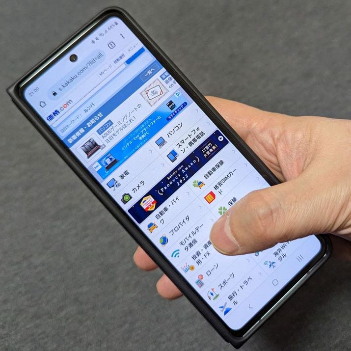 広げた状態でのメインディスプレイの使いやすさは十分すぎるほど満足でき、文字の打ちやすさはもちろん、WebブラウザーはPC版のサイトを表示しても見やすく、まさにスマホとタブレットのいいとこ取り。実はそれ以上に気に入っているのが、折りたたんだカバーディスプレイでの使い勝手です。画面サイズと縦横比が絶妙なバランスで、画面の端まで指が届いて片手で操作可能、かつ縦長のディスプレイでWebブラウザーやSNSの可読性が高いことから、たたんだ状態で使う時間のほうが明らかに多いくらいです。一括で約25万円と高価な機種ですが、満足度の高い買い物でした。