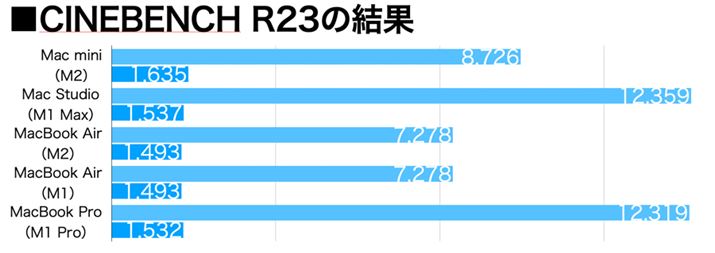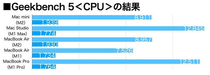 定番のベンチマークソフトの結果は以下のとおり。ほぼ予想どおりではありますが、「M1 Max」を搭載した「Mac Studio」と比べると、CPUの差はそれほど大きくはありませんでした。ワンランク上の「M2 Pro」なら「M1 Max」に勝てるかもしれません。