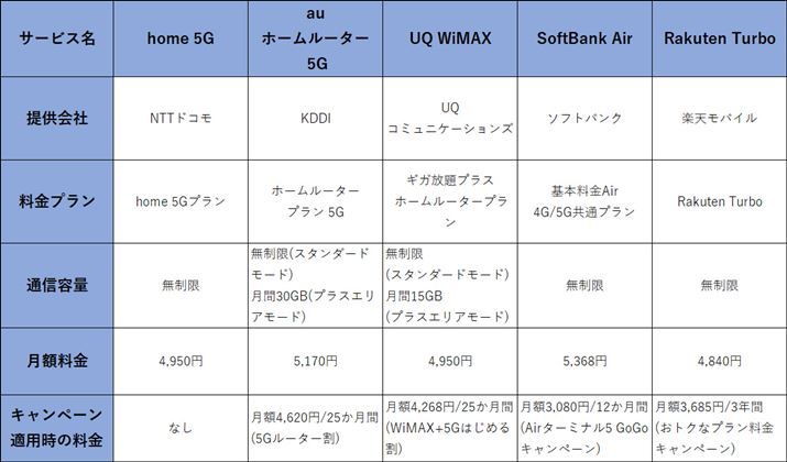 では実際のところ、FWAを利用するにはどの程度の料金がかかるのだろうか。主なFWAサービスの料金を比較してみると、いずれも月額5,000円前後でデータ通信が使い放題だが、最も高い「SoftBank Air」と最も安い「Rakuten Turbo」とでは500円程度料金に違いがある。ただ、「home 5G」以外はキャンペーンの適用で1〜3年間基本料を割り引かれることから、期間中はより安価な料金での利用が可能なことは覚えておきたい。