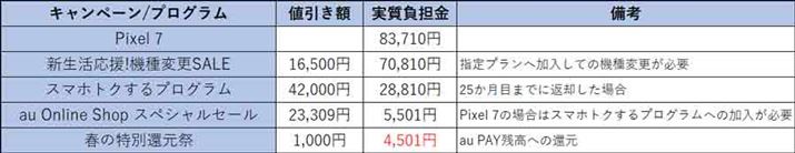 さらに筆者はauの端末購入プログラム「スマホトクするプログラム」を適用して端末を購入している。それゆえ先の値引きを適用し、25か月後に「Pixel 7」を返却すると実質負担金は28,810円となるのだが、重要なポイントはもうひとつの値引きだ。