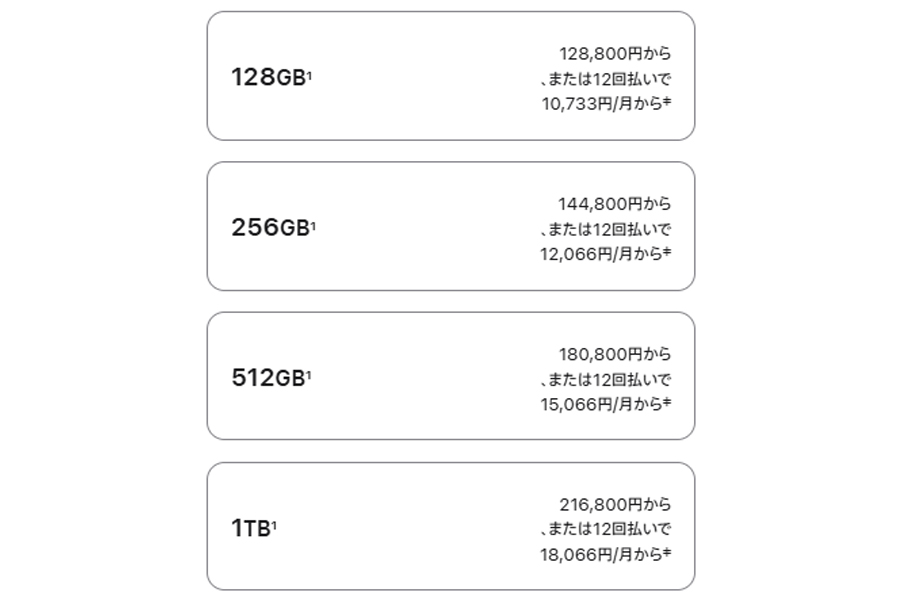 たとえば、「iPad Pro」シリーズの2モデルは256GB、512GB、1TB(=1000GB)、2TB(=2000GB)の4種類を選択できますが、もし積極的に映像制作などを行う想定ならば1TB以上のモデルを選ぶのがおすすめです。ただし、その場合の価格は11インチモデルでも272,800円〜となり、最小構成の168,800円と比べてかなり高額になります。