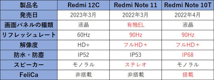 かなり厳しめの評価となってしまったが、前モデル2機種がコストパフォーマンスを追求しているのに対して、こちらは絶対的な低価格を追求しているという違いがその原因だろう。以下に、「Redmi 12C」「Redmi Note 11」「Redmi Note 10T」の基本性能を表にまとめた.