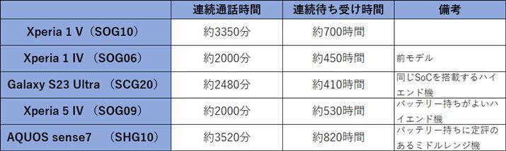 先駆けて公開されているau版のスペックでバッテリー持ちの進化を見てみよう。連続通話時間は「Xperia 1 V」が3350分、前モデル「Xperia 1 IV」が約2000分なので、5割以上伸びている。連続待ち受け時間は約700時間で、「Xperia 1 IV」の約450時間からこちらも大幅に伸びている。この「Xperia 1 V」の電池持ちのよさは、ハイエンドモデルとしては破格だ。価格帯もコンセプトも本機とまったく異なるが、1週間以上の電池持ちを標榜するシャープ「AQUOS sense7」の連続通話時間が約3520分、連続待ち受け時間が約820時間と比較できる値であることからも、そのすごさが理解できるだろう。