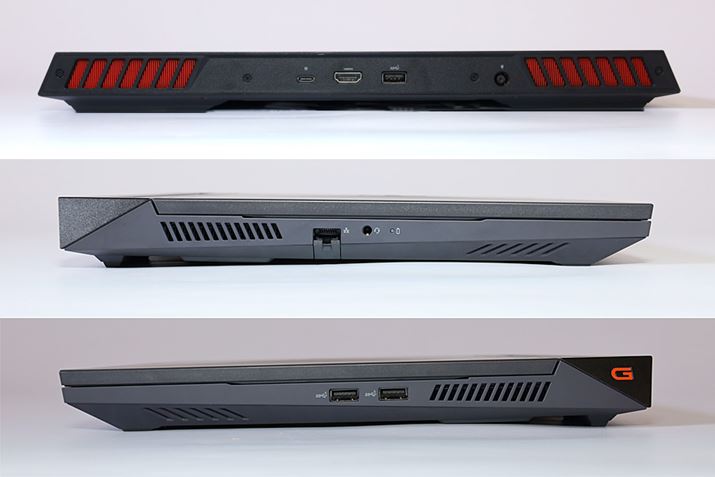 デルのゲーミングノートPCは、ディスプレイのヒンジが他社のモデルに比べて少し手前にあるのが特徴。これにより、内部のパーツ配置を最適化し、すぐれた冷却性能を発揮できるという。ヒンジ横にはオレンジ色のGマークが配置されています