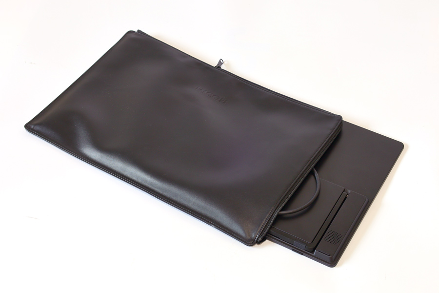 本体サイズは356.0(幅)221.7(奥行)×4.8〜10.8(厚さ)mm、重量は約715g(有線モデルはバッテリーを内蔵しない分、約560gとさらに軽量!)。実測では709gとカタログスペックよりも軽かったです。もちろん、15.6型のモバイルディスプレイとしては軽い部類に入ります。スリーブケースが付属しており、持ち運びも楽々。棚やカバンにしまうときもスリーブケースに入れておけば、ケーブルをまとめておけて便利です。