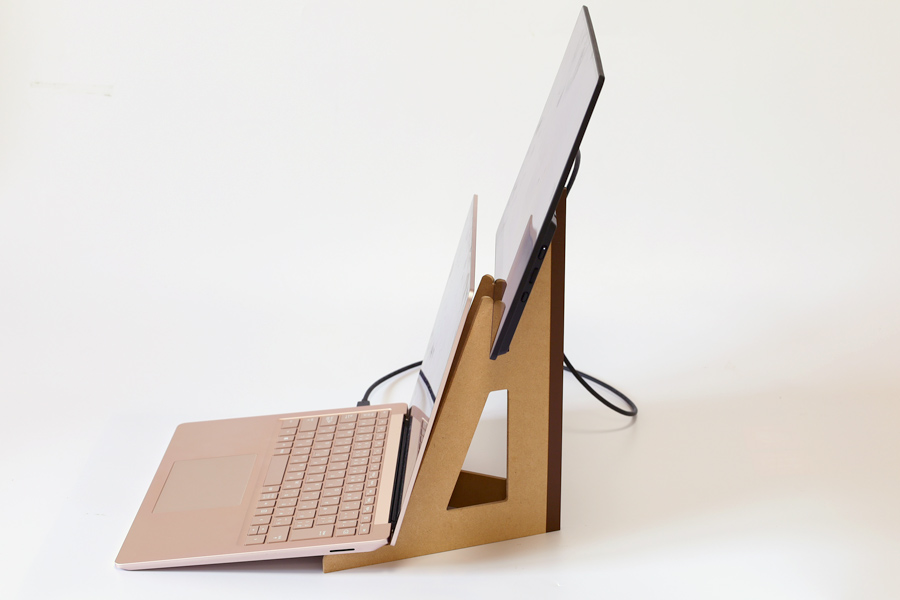 フィラメントとNECパーソナルコンピュータが共同開発したモニタースタンド「WINF BINDER」を使って、縦に並べてみました。ノートパソコンの横にモバイルディスプレイを置くスペースがなくても、これがあれば縦2画面で作業ができます