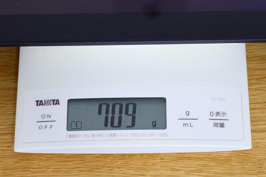 キッチンスケールでの実測はカタログスペックよりも軽い709g(本体のみ)でした