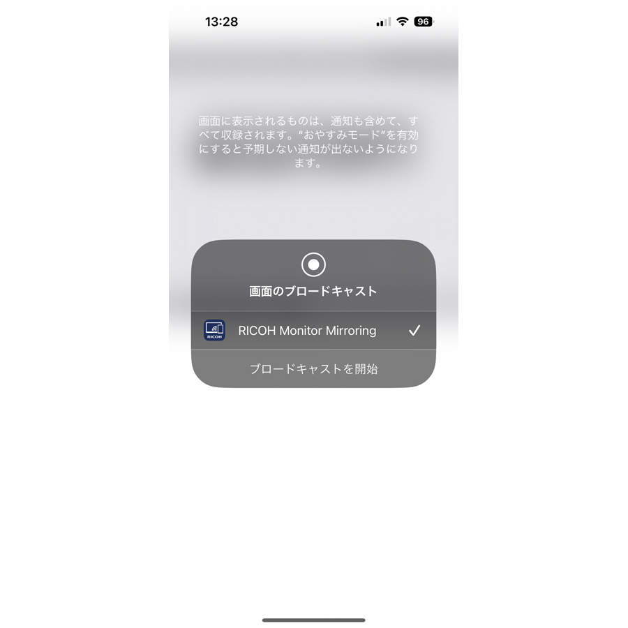 専用アプリ「RICOH Monitor Mirroring」(無料)。「RICOH Light Monitor 150BW」の入力を無線接続にし、本アプリを起動し、「ブロードキャストを開始」をタップすればミラーリングがスタートします