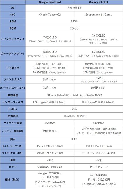 細かなスペックは下記表をご覧いただきたいのですが、この時点で注目なのが「Pixel Fold」と「Fold4」のスペックがかなり似ていること。使い勝手を大きく左右する違いは下記の3つです。