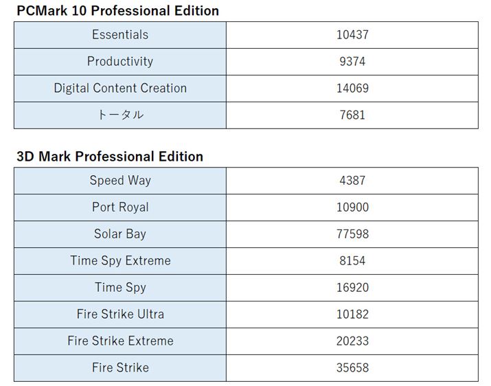 ベンチマークアプリの結果はいずれも期待通りのハイスコア。パソコンの総合性能を測定する「PCMark 10 Professional」の結果はトータルが7681で7000オーバー。「Productivity」以外は10000オーバーで、基本性能の高さがうかがえます。グラフィック性能を測定する「3D Mark Professional Edition」も全テストで高得点。「GeForce RTX 4070」はミドルクラスのGPUですが、これだけのスコアなら、ほとんどのゲームを快適に楽しめるでしょう。