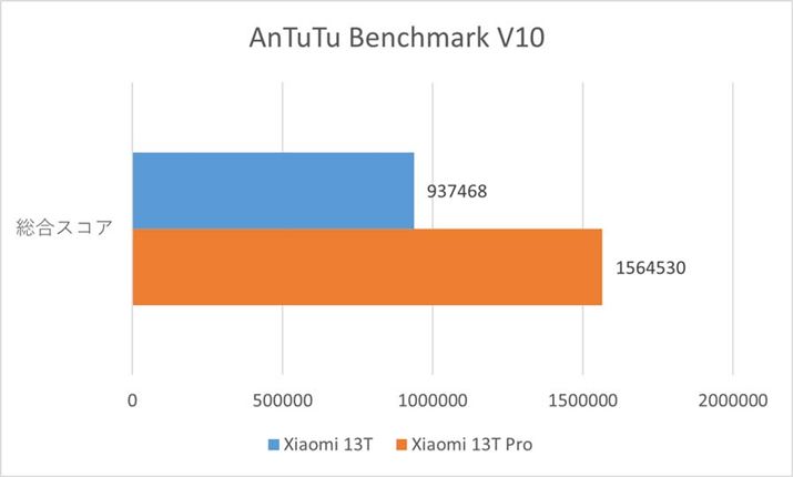 いっぽう、「Xiaomi 13T Pro」は「AnTuTu Benchmark V10」の総合スコアが1564530、「Geekbench 6」のMulti-Core Scoreが4562、Single-Core Scoreが1759、GPU OpenCL Scoreが7915です。