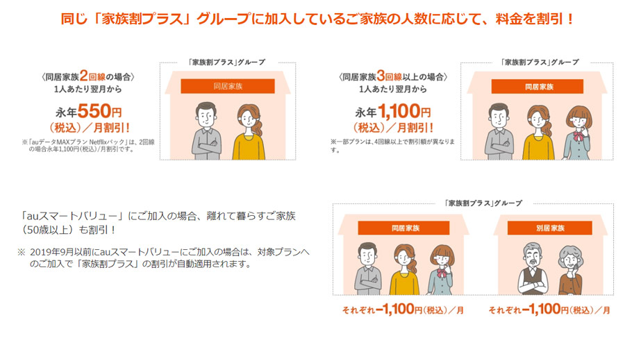なかでもauの「家族割プラス」はグループを組むための条件が厳しく、対象プランに加入しており、なおかつ同居している必要がある。離れた家族とグループを組むには「auスマートバリュー」に加入しており、なおかつ離れている家族の年齢が50歳以上という条件をクリアしなければならずハードルがかなり高い。