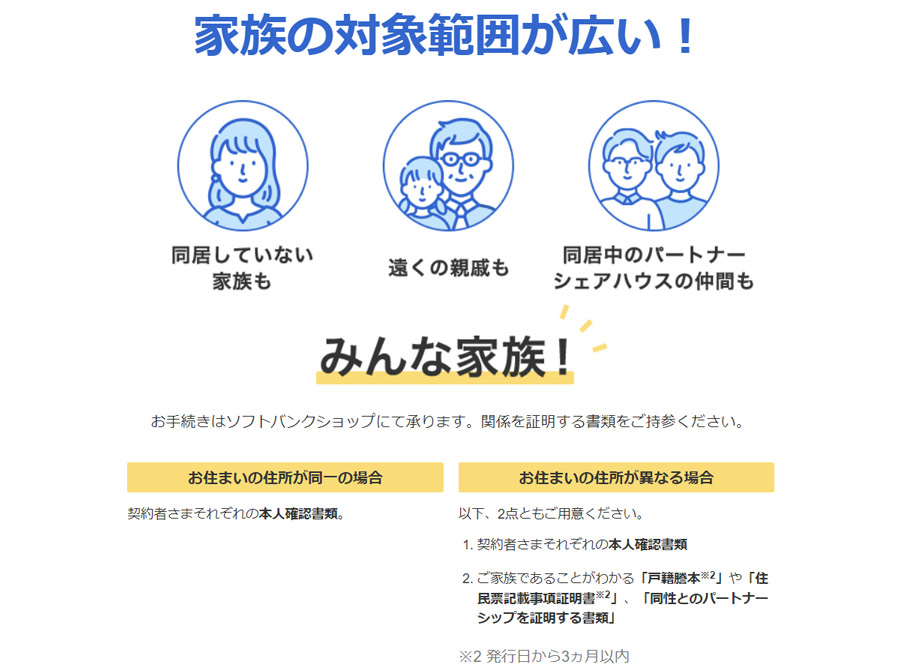 ソフトバンクのWebサイトより。ソフトバンクの「新みんな家族割」はグループを組める対象がかなり広く、親等数の制限がないほか、同一住所であればシェアハウスの住人同士でグループを組める