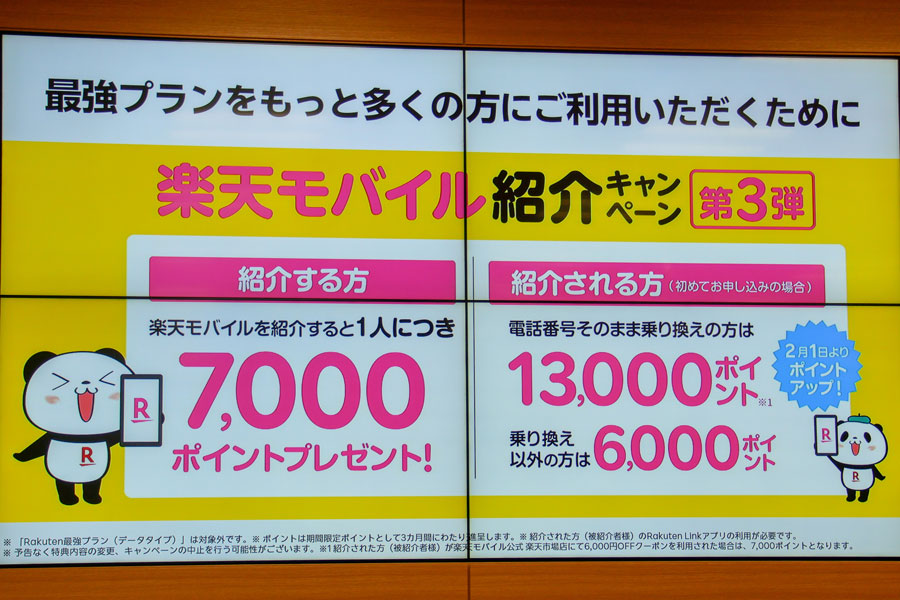 楽天モバイルは既存ユーザーによるクチコミでの顧客獲得に力を入れており、現在展開している「紹介キャンペーン」は紹介した側に7000ポイント、紹介された側が他社から乗り換えた場合は13000ポイントが入る仕組みだ