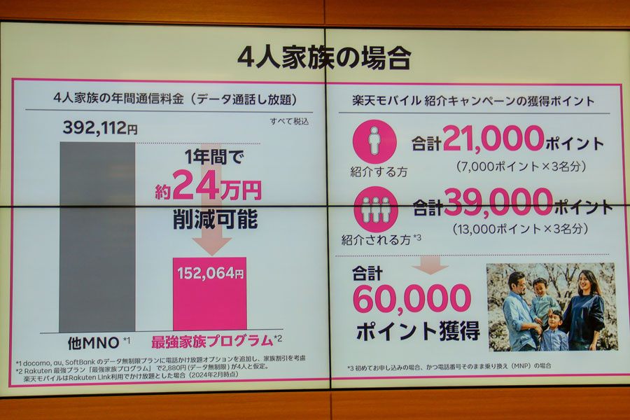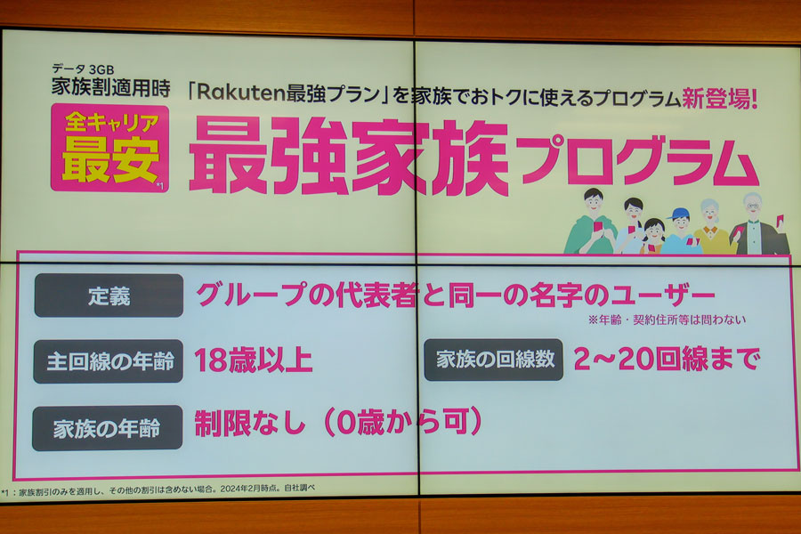 楽天モバイルは2024年2月21日に「最強家族プログラム」の提供を開始。家族割引施策で他社に追随する形だ