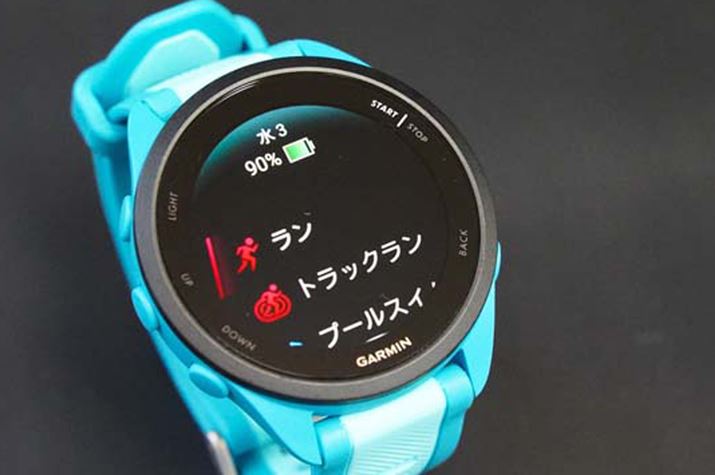 有機ELディスプレイは、中級ランナー向けモデルの「Forerunner 265」に比べて0.1インチだけ小さい1.2インチ。重量も39g(ベルトを含む)とかなり軽量な設計です。個人的には、大きいサイズが好みではありますが、有機ELディスプレイが鮮やかなので、数値も見やすく、サイズの小ささを補って勝る操作性が魅力的です。
