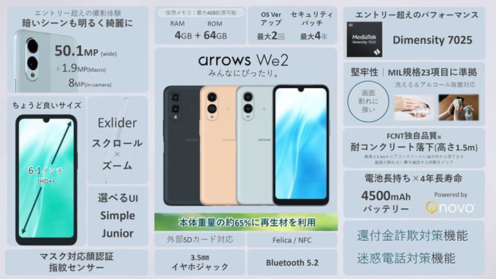 「arrows We2 Plus」は、約6.6インチのフルHD+表示対応の有機ELディスプレイ(qOLED)を備えたミドルレンジモデルだ。IPX5/8等級の防水仕様、IP6X等級の防塵仕様に加えて、米国国防総省の調達基準「MIL-STD-810H」の23項目をクリアしている。また、高さ1.5mからコンクリート面への落下に耐える耐衝撃性能や、浴室での使用、ハンドソープで丸洗いできるなど「arrows We2」と同レベルのタフネス性能を備えている。加えて、「スライドインランチャー」や「FASTフィンガーランチャー」「FASTメモ」といった独自の操作機能も搭載されている。