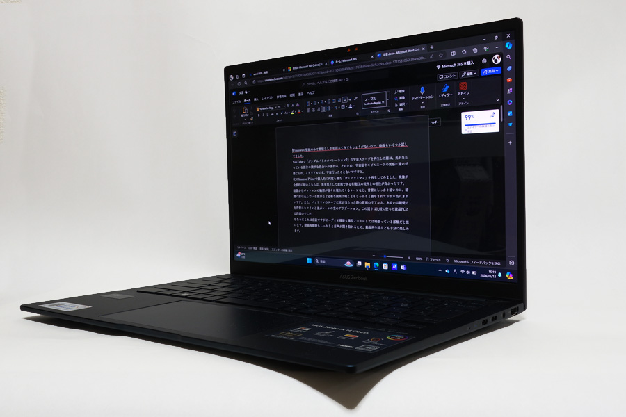 「UX3405MA-U7161W」は、インテルの最新CPUを搭載するなどスペック面でも高いものがあります。さらに、同スペック(「Core Ultra 7」、メモリー16GB、SSD 1TB、Microsoft Office非搭載)の液晶ディスプレイ搭載モデルと比べてもほとんど価格差はありません(「UX3405MA-U7161W」の最安価格は164,800円。それに対して、同水準スペックの液晶ディスプレイモデル3製品の最安価格平均は168,886円。2024年5月14日時点の価格.com最安価格)。本機はスペックに対するコスパが優秀なのです。