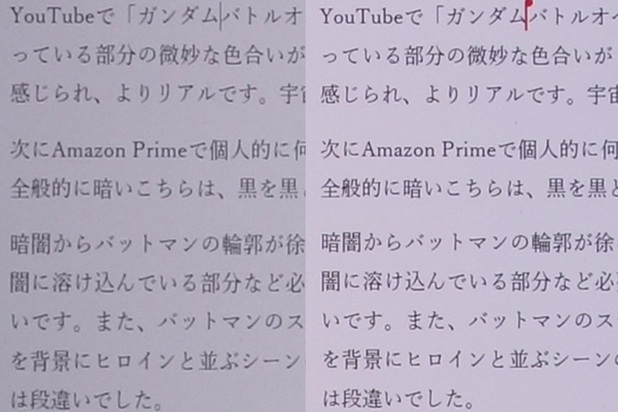 有機ELディスプレイと液晶ディスプレイの違いを感じられる部分はメディア再生時以外でもあります。簡単な文字入力を行う際でも、液晶ディスプレイだと文字に白みがかかっているように見えますが、有機ELディスプレイだと文字がくっきりとして明らかに視認性が高くなります。