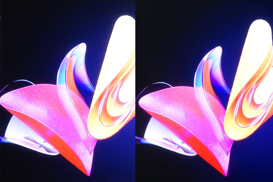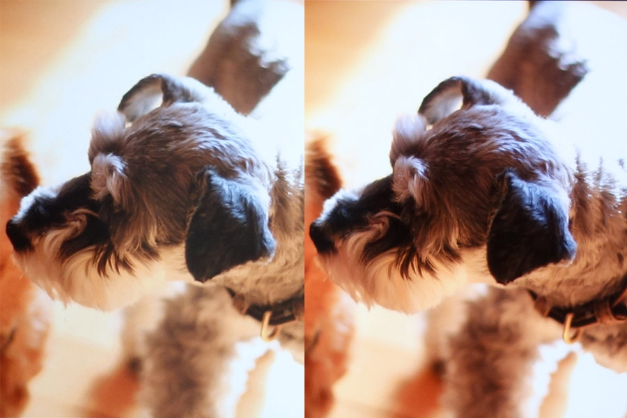 輝度を最高にして写真を表示したところを並べて撮影後に一部抜粋して表示。左が液晶の「Latitude 5340」、右が「UX3405MA-U7161W」。「UX3405MA-U7161W」の方が自然な色合いで表示できており、立体感が感じられます