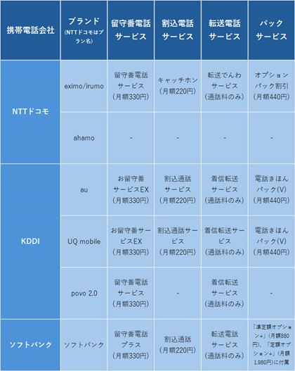 各サービスを単独で契約した場合の料金も、各社でおおむね共通している。留守番電話は月額330円、割込通話は月額220円、転送電話は無料だが通常の通話料がかかる、といった具合だ。また、複数のオプションをひとまとめにして安価に提供するパックサービスも用意されている。具体的には、NTTドコモであれば「オプションパック割引」、KDDIであれば「au」「UQ mobile」向けに「電話きほんパック(V)」を契約することで、それぞれ留守番電話や割込通話などが月額440円で利用できる。