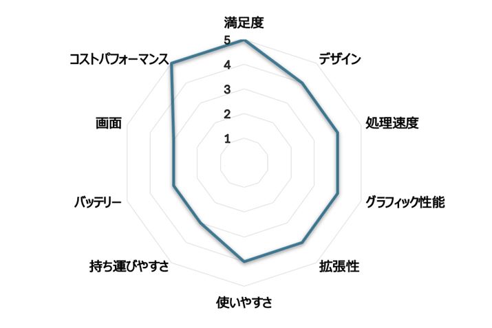 評価項目:満足度、デザイン、処理速度、グラフィック性能、拡張性、使いやすさ、持ち運びやすさ、バッテリー、画面、コストパフォーマンス