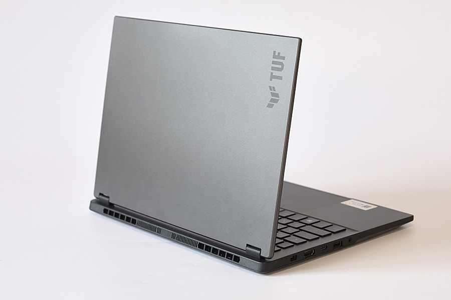デザインはほかの「TUF Gaming」シリーズと同様、装飾が控えめなシンプルな見た目。本体カラーは「イェーガーグレー」という、落ち着いた色味です。ゲーミングノートPCというと光るイメージがあるかもしれませんが、本モデルにはライティング機能はなく、派手なデザインが苦手な人にもすすめられます。