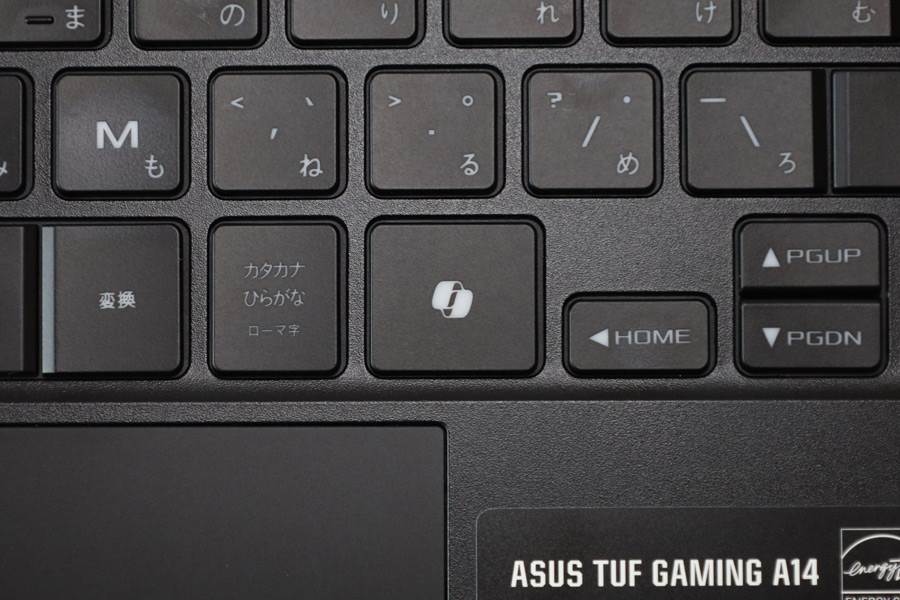 オーソドックスなレイアウトのキーボード。ボリューム、マイクのオン・オフ、動作モードなどを変更できる「Armoury Crate」を呼び出すキーが独立しています