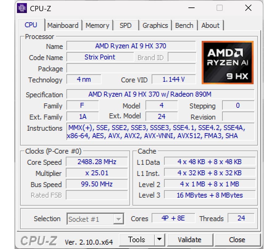 「Ryzen AI 9 HX 370」の詳細情報(CPUの情報を確認できる「CPU-Z」でチェックしたもの)