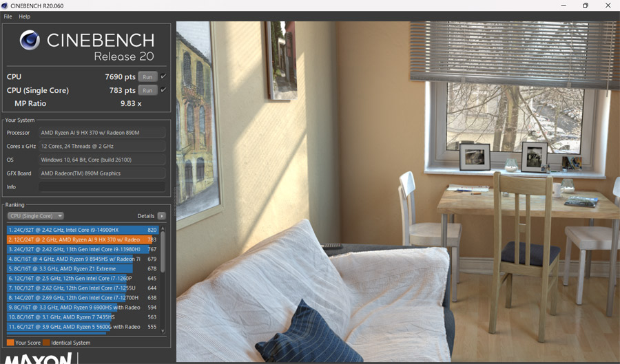 CPUの処理性能を測定する「CINEBENCH R23」の結果。インテルの「Core i7-12700H」とほぼ同じスコアでした
