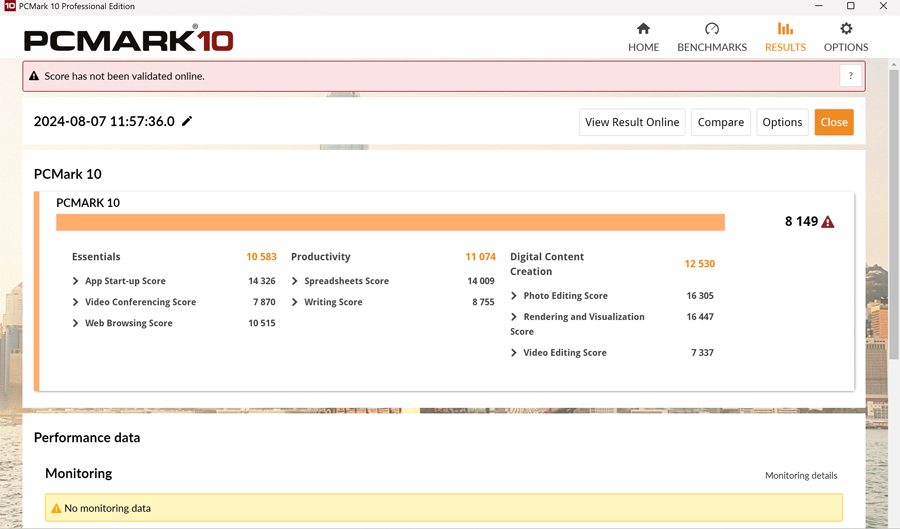 パソコンの総合性能を測定する「PCMark 10 Professional Edition」の結果。総合スコアが8149と非常にハイスコアです