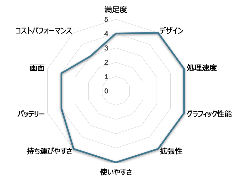 評価項目:満足度、デザイン、処理速度、グラフィック性能、拡張性、使いやすさ、持ち運びやすさ、バッテリー、画面、コストパフォーマンス