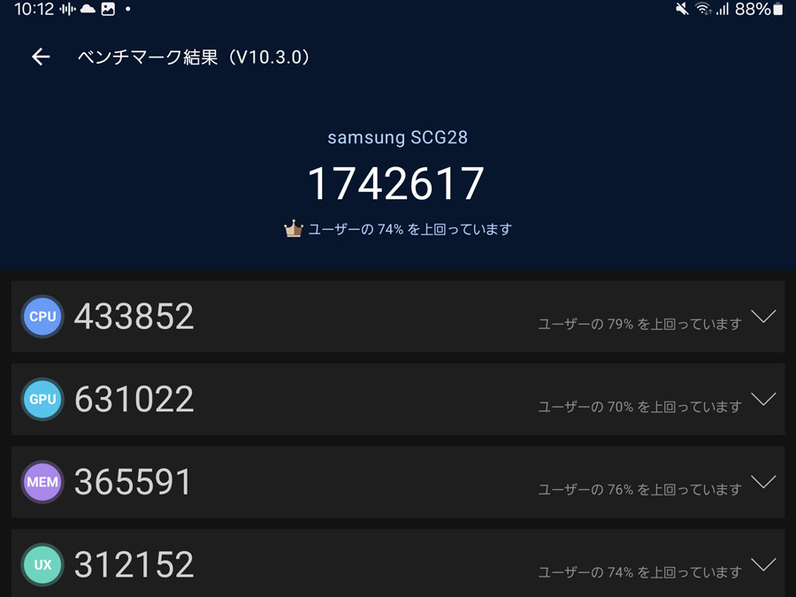 人気のベンチマークアプリ「AnTuTuベンチマーク(バージョン10.X)で処理性能を計測したところ、総合スコアは1742617となった。同じSoCを搭載する「Galaxy S24 Ultra」の総合スコア、2075120と比べると控えめな結果だ。