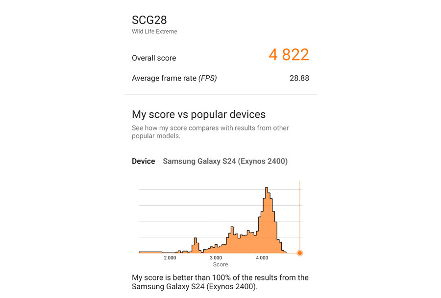 「3DMark」の「Wild Life Extreme」のスコアは4822。同じSoCを搭載する「Galaxy S24 Ultra」の5110と比較すると1割ほど低い結果だ