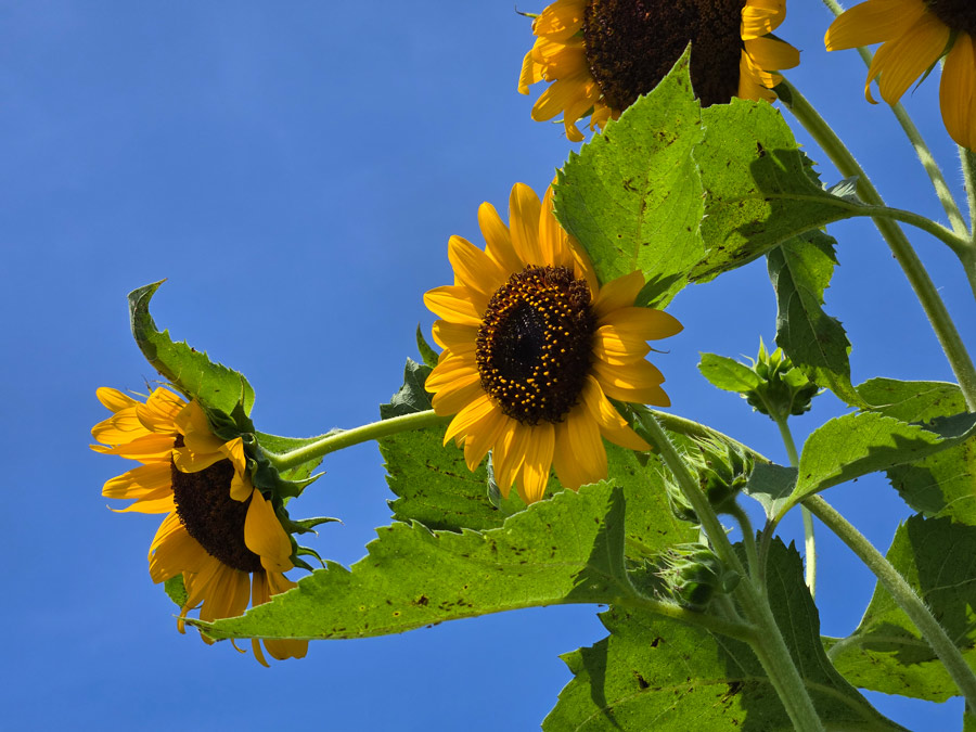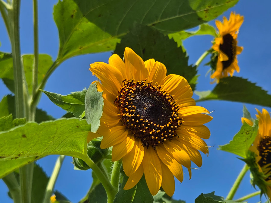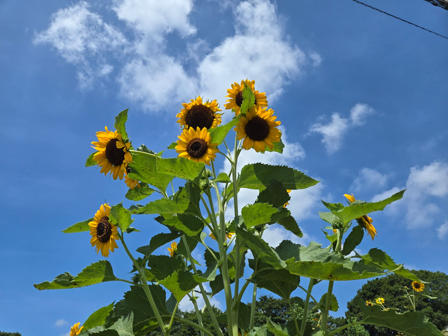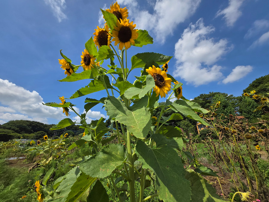 望遠カメラに切り替えて撮影。青空に浮かぶひまわりが印象的で、中望遠のため広角主体の通常のスマートフォンとは印象の異なる構図になる