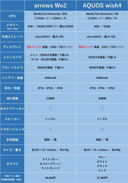 どちらもMediaTek製のSoCを採用しており、「arrows We2」が「Dimensity 7025」、「AQUOS wish4」が「Dimensity 700」。どちらもミッドレンジ向けだが、「Dimensity 7025」のほうが新しく、性能も高い。