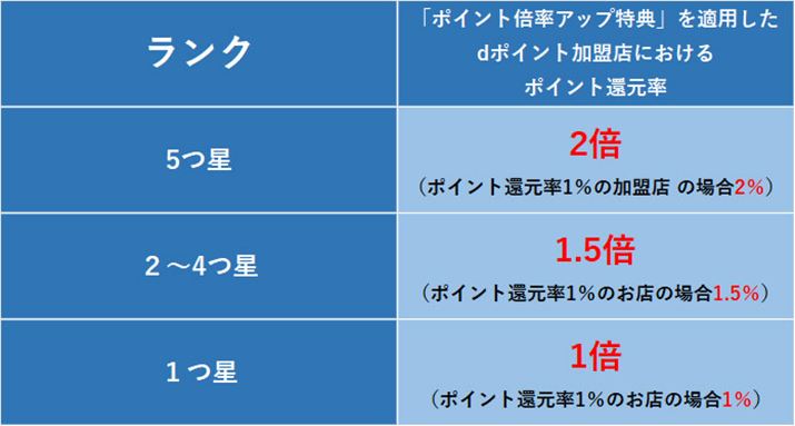 さらに「d払い」を使用したお店が「dポイント加盟店」である場合、会員ランクごとに以下の改定された「ポイント倍率アップ特典」が加わります。
