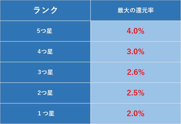 このように、新しいポイントプログラム における5つ星の還元率は4%という競合サービスと比べても非常に高くなっています。また、2つ星でも2.5%と高めです。ヘビーユーザーに手厚いいっぽうで、そこまで「dポイントクラブ」を積極的に活用していないユーザーにもより多く還元されるルートが用意されているのが特徴です。
