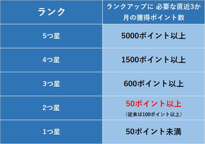 還元率とともに注目したいのがランクアップ基準の変更です。「dポイントクラブ」のランクは、直近3か月にためたポイント額で決められていますが、新しい判定基準では2つ星の獲得に必要な獲得ポイントが従来の100ポイントから半分になった50ポイントに改められています。